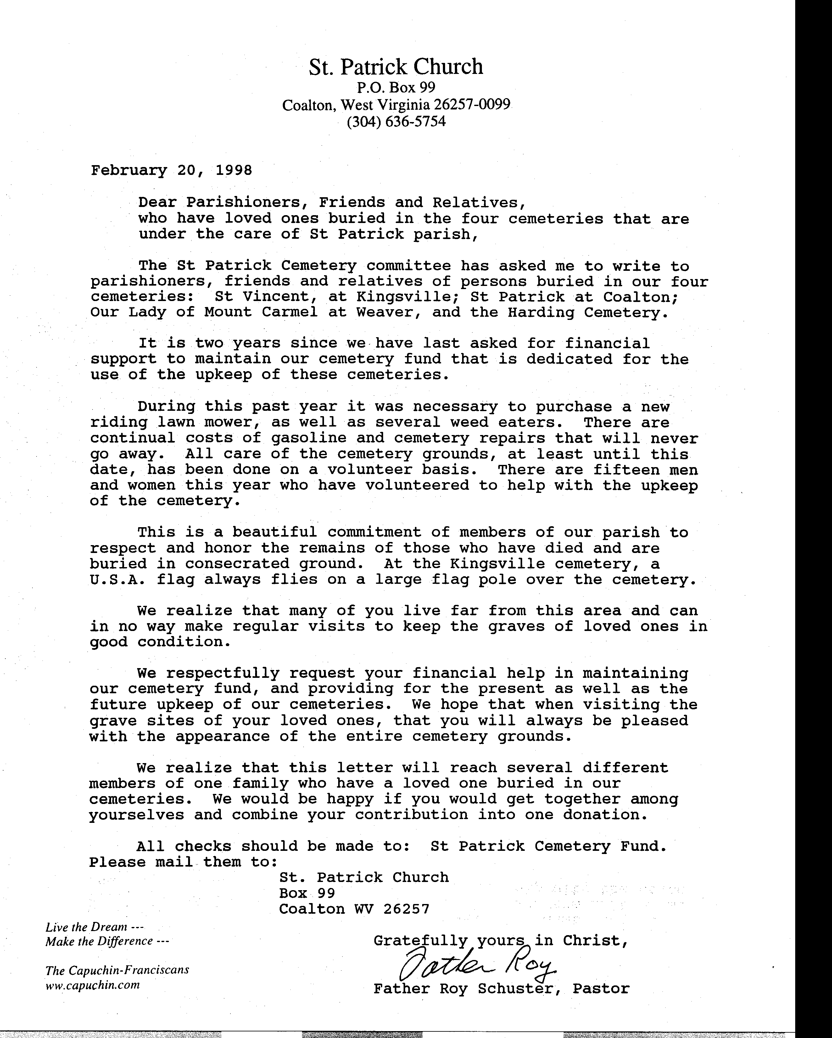 St. Patrick's Church in Coalton, West Virginia (see photo) is where Donato and Josephine were married and where all their children were baptized, excluding George. It is also the location of baptism of Giacomo and Caterina's first seven children before moving to Beckley, West Virginia. Donato and Josephine's first child, Blaise Michael Leeber, is buried in St. Vincent's Cemetery in Kingsville, which is owned by this church. Please help them in their quest to keep their cemeteries beautiful and keep our family's memory alive. Thank you!